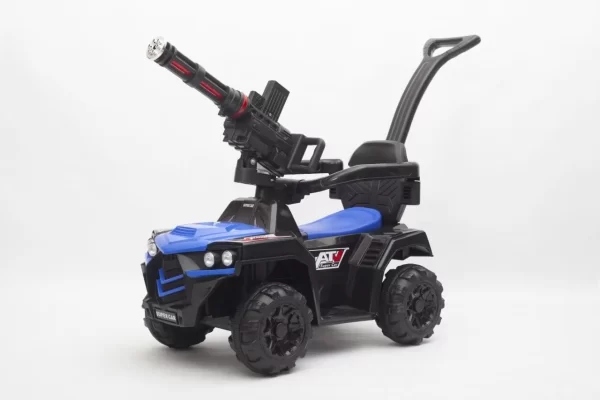 Interactive Gatling Wheel: Fun rotating gun-shaped handlebar for playful steering.