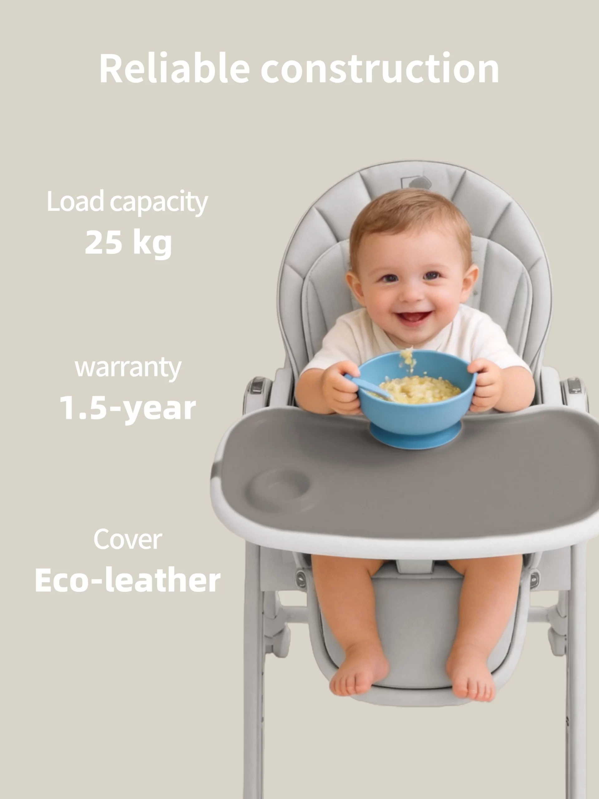 Contoured backrest and padded seat offer comfort. Ideal for long – term use during meals, reducing baby’s restlessness.